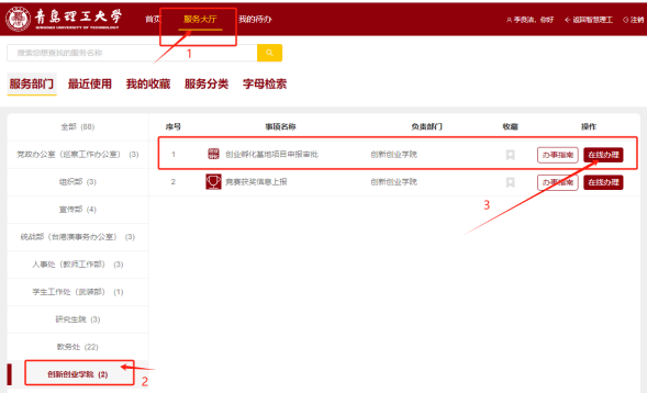 1.申报入驻项目负责人需通过“智慧理工”线上申报,在“服务大厅”中选择“威廉希尔williamhill”,点击“创业孵化基地项目申报审批”在线办理,按页面提示填写项目入驻申报相关信息及相关支撑材料,并上传项目创业计划书(计划书模板可在线下载)。