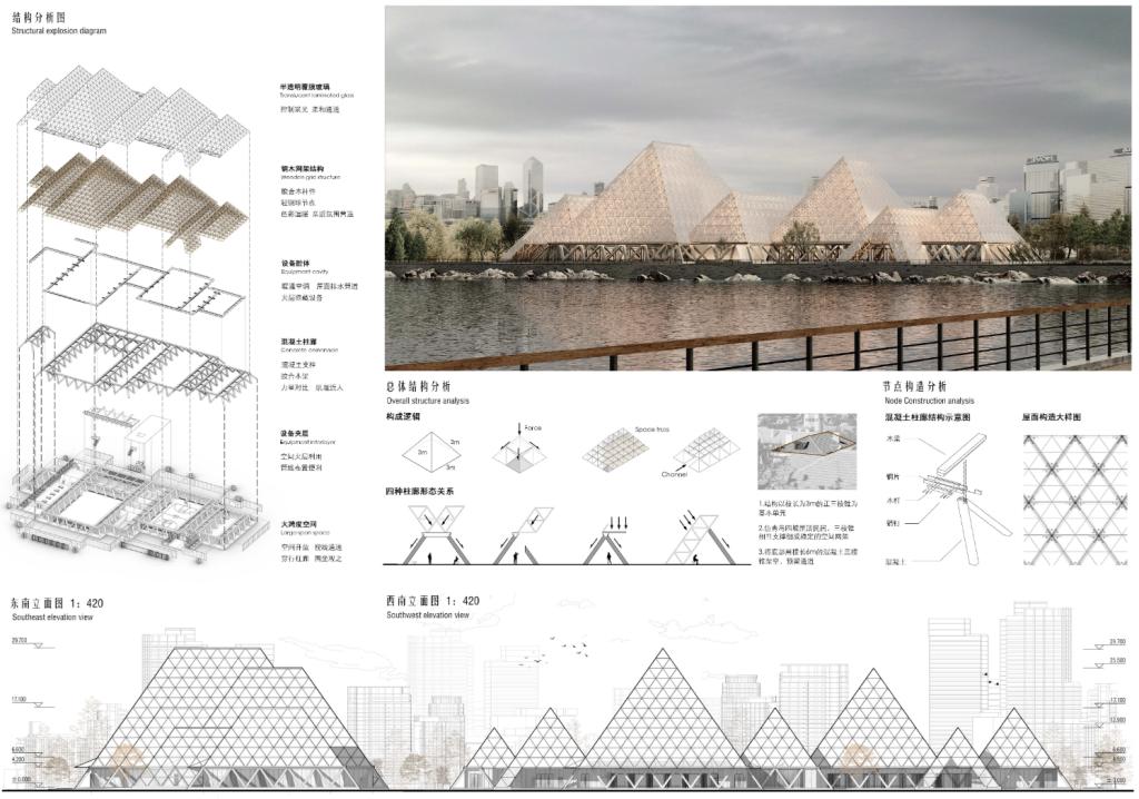 潘建成同学的作品以“摆渡人和他的故事”为题,提出“记忆重组”的设计概念,回应城市更新语境下人们对过往历史与场所精神的感知重构。设计从四类“记忆碎片”出发——正常记忆、关键记忆、可能记忆与遗忘记忆,运用“重组”逻辑进行空间语言转译。场地被理解为一个层层推进的记忆容器,观者在四章叙事中穿行——序章唤起、过章重构、续章生长、终章沉淀。空间序列引导观者在碎片、缝隙与交错中展开身体记忆的再书写,形成理性与感性交织的建筑体验,构建一个既承载过往又启发当下的文化地标。傅旭威同学的参赛作品以“走!去里院耍”为题,伙伴的一声吆喝,不仅是运动的邀约,更是老青岛邻里社交方式最质朴的呈现。在钢筋混凝土林立,公众活动场合受到挤压的今天,场馆摒弃了专业场馆的距离感与功利性,以一声邻里招呼般的亲切呼唤——“走!去”,宣告空间的绝对开放与零门槛,引导人们回到传统里院生活中的情感锚点,鼓励所有人即刻运动、轻松融入。 在这里,“院”不仅是三角柱廊围合出的物理院落,更是指向一种温情、包容、归属感的社区精神,回归最纯粹的生活享受与人际互动。